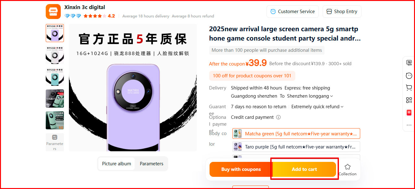 1. Select the product you are interested in and its parameters: color, size, quantity, etc. Click the orange button "Add to cart".