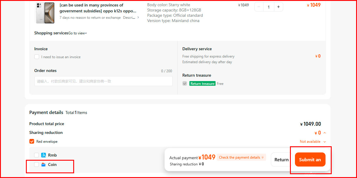3. To pay with Visa or Mastercard cards, select the "Coin" option and click the "Submit an order" button.