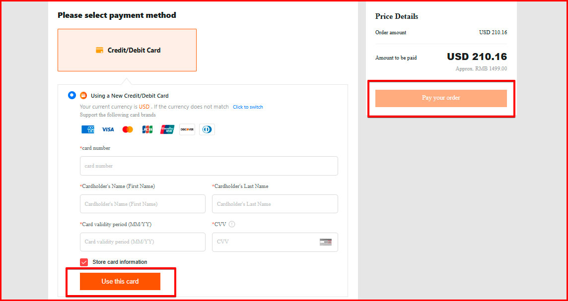 4. In the next window, add a card - write the card number, name and surname, expiration date and CVV, click the "Use this card" button and then the "Payyour order" button.