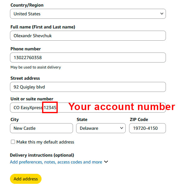 Yes! You can add as many recipient addresses as you like. This can be done via the Recipients menu in your Profile. To do this, you just need to click Add address and fill in all the fields. Delivery from the USA to Ukraine will be carried out to the address that you have indicated as the main one when registering the parcel. Please note that if the recipient is another person, the recipient’s information must contain their passport details and phone number, not yours. In addition, if the shipping cost has not been paid in advance, the recipient will have to pay for it at the time of delivery.
