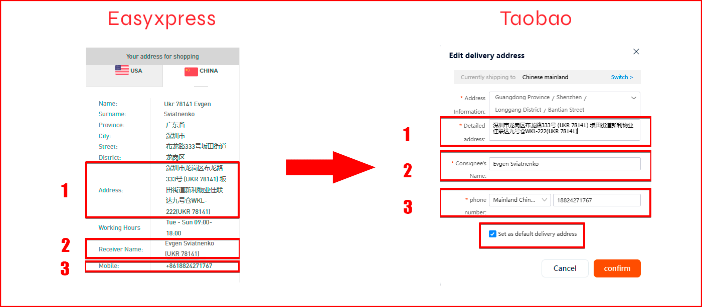 - во вторую строку добавьте номер телефона из поля "Mobile" личного кабинета Easyxpress. Вводите номер без кода +86;