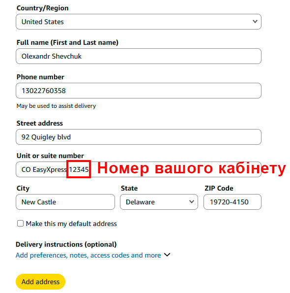 Якщо ви хочете купувати різні товари в США, то вам потрібна американська адреса, на яку будуть надходити посилки. Компанія EasyXpress надає таку послугу, причому безкоштовно. Після реєстрації на нашому сайті ви отримаєте доступ до особистого кабінету та власну адресу в Америці. Саме його і потрібно вказати як місце доставки в Амазоні. Якщо у вас виникли проблеми з реєстрацією, то можете переглянути нашу інструкцію за даним посиланням або просто звернутися до менеджерів через форму зворотного зв'язку або по телефону. Приємного шопінгу!
